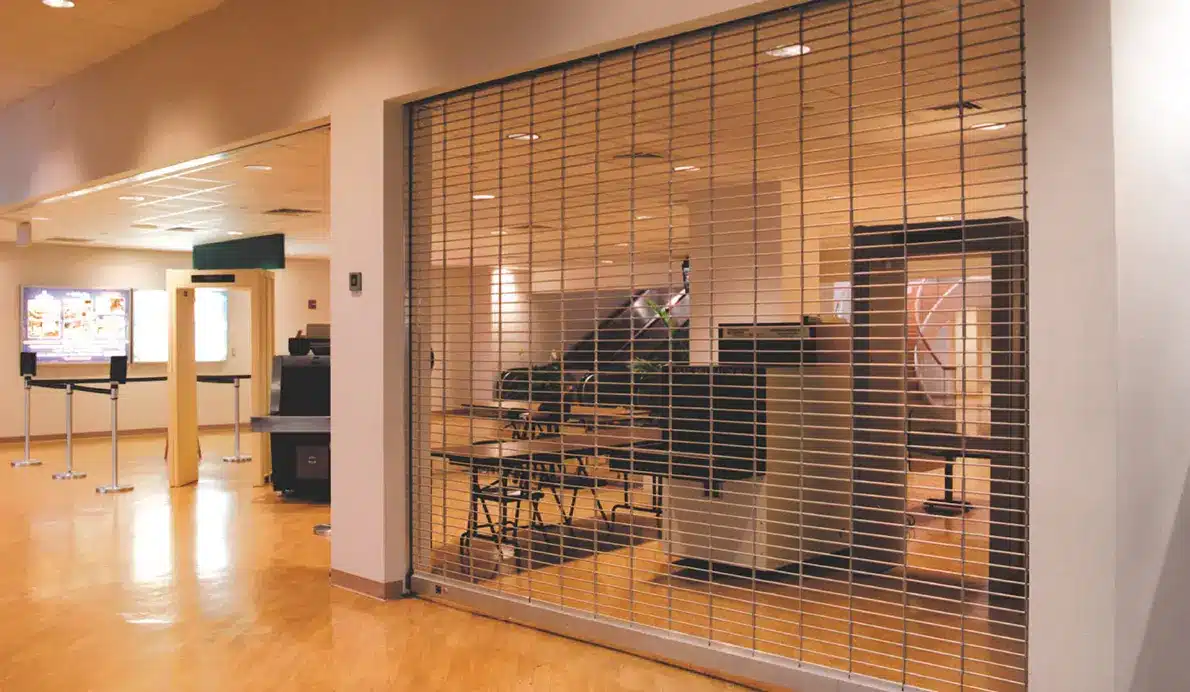 Coiling aluminum or steel grilles to secure areas requiring visual access and air circulation