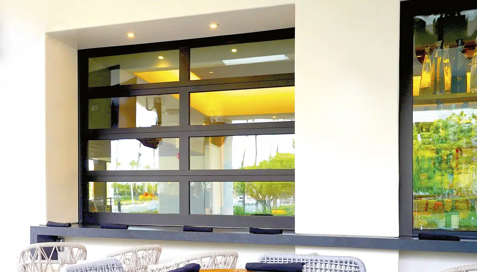 The VertiStack Clear door features a unique construction with sections that stack above the opening, eliminating the need for overhead tracks. This allows for a clear ceiling and won’t conflict with mechanical, electrical or plumbing fixtures located in the ceiling. Designed with a clean, modern aesthetic, there are no hinges or exposed tracks or cables, and it is available with a variety of aluminum finishes and window materials.